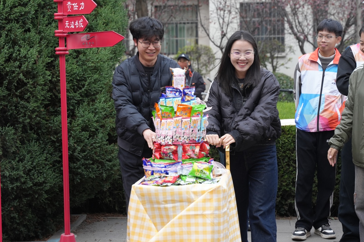 说到生日的仪式感,怎能缺少甜蜜?当白燕书院综合办主任郭丽婷老师与杏花书院发展导师王丕达老师推着堆满薯片、饼干的零食蛋糕登场时,现场瞬间爆发出欢呼声祝十月的寿星们,每天都甜甜蜜蜜!随着两位老师将一把把零食抛向台下,同学们笑着伸手争抢这份“甜蜜幸运”,会场彻底变成欢乐的海洋。而当甜蜜的喧嚣落定,会场进入了专注的“创造模式”。彩色的小豆粒在寿星们的指尖跳跃,动听的歌声从孙浩凯和徐彦琳同学的嗓子里迸出,而每个底盘上,逐渐显现出爱心、“10·24”、HAPPY。当一个个独一无二的“个人符号”在同学们手中成型,幸福值在专注与愉悦中悄然涨至98%。