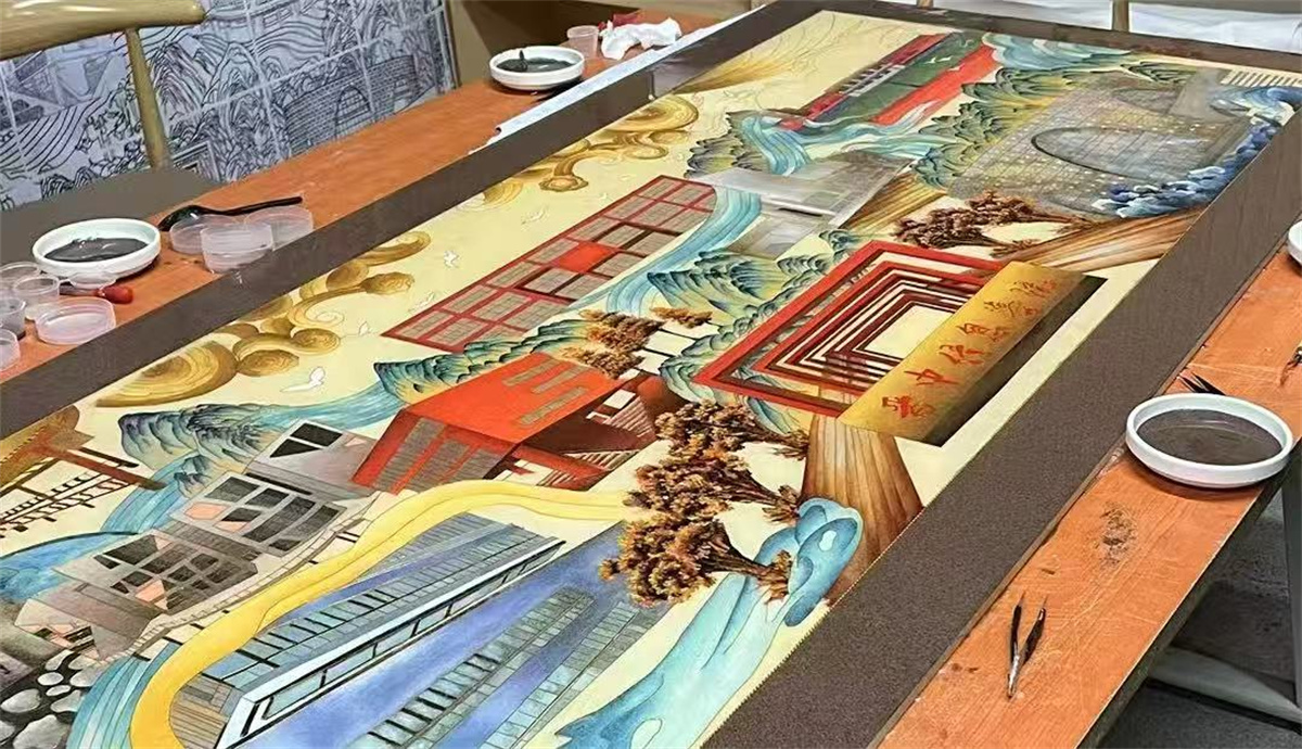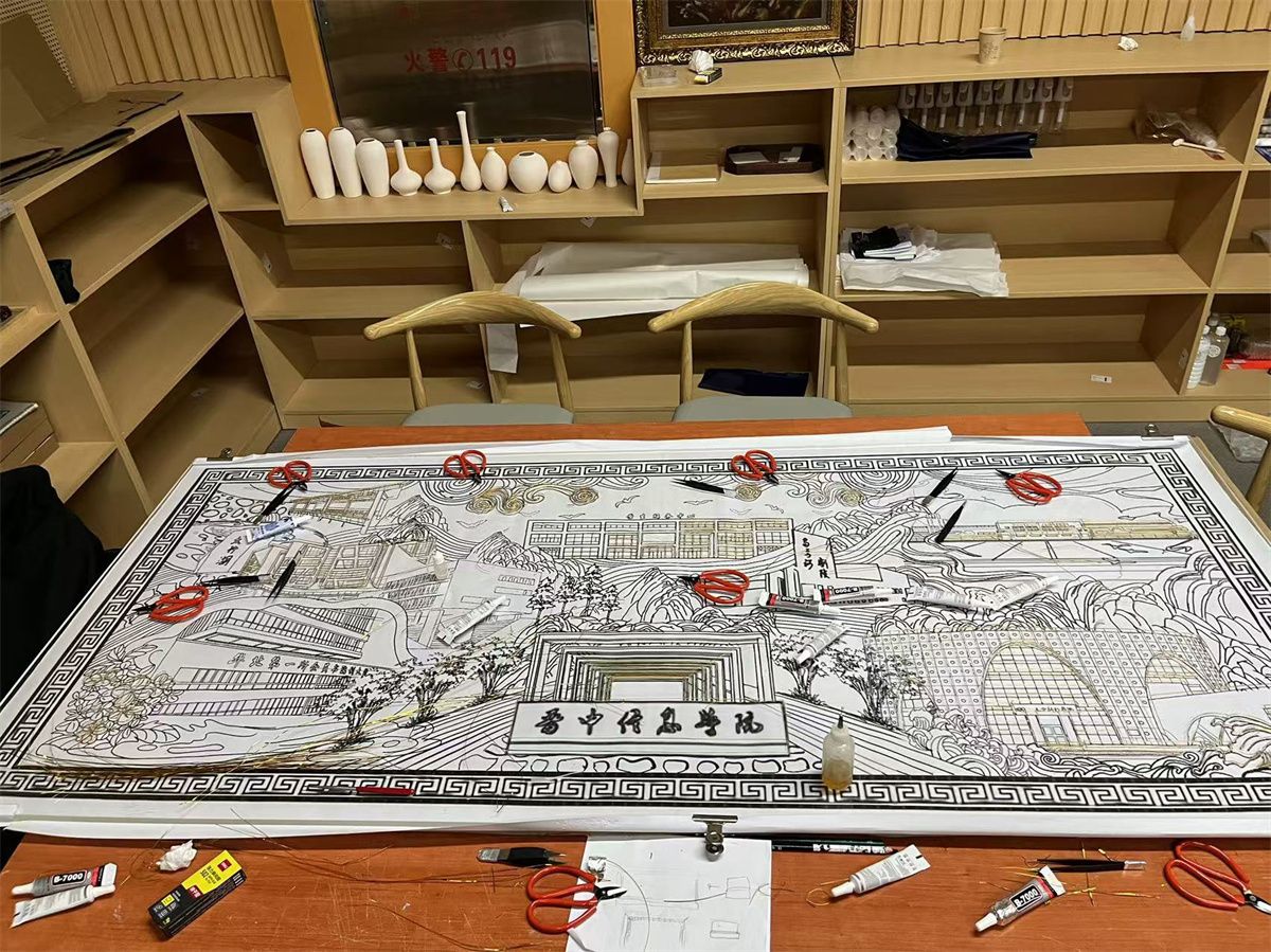 掐丝珐琅作品《遇见信院》以校园场景为创作基底,依托花丝珐琅这一非遗技艺,将课堂时光、校园景致等专属青春记忆,转化为可触摸、可观赏的实体作品。学生非遗研究员崔宇悦介绍到“这件集体创作的作品,既凝聚了同学们对校园生活的共同情感共鸣,通过学生创作者的全新表达,让花丝珐琅这一传统技艺在新时代语境下焕发新的活力,更展现了学校在非遗特色育人实践中的积极探索。”