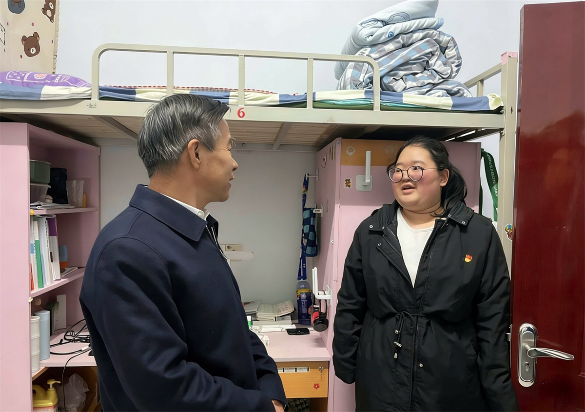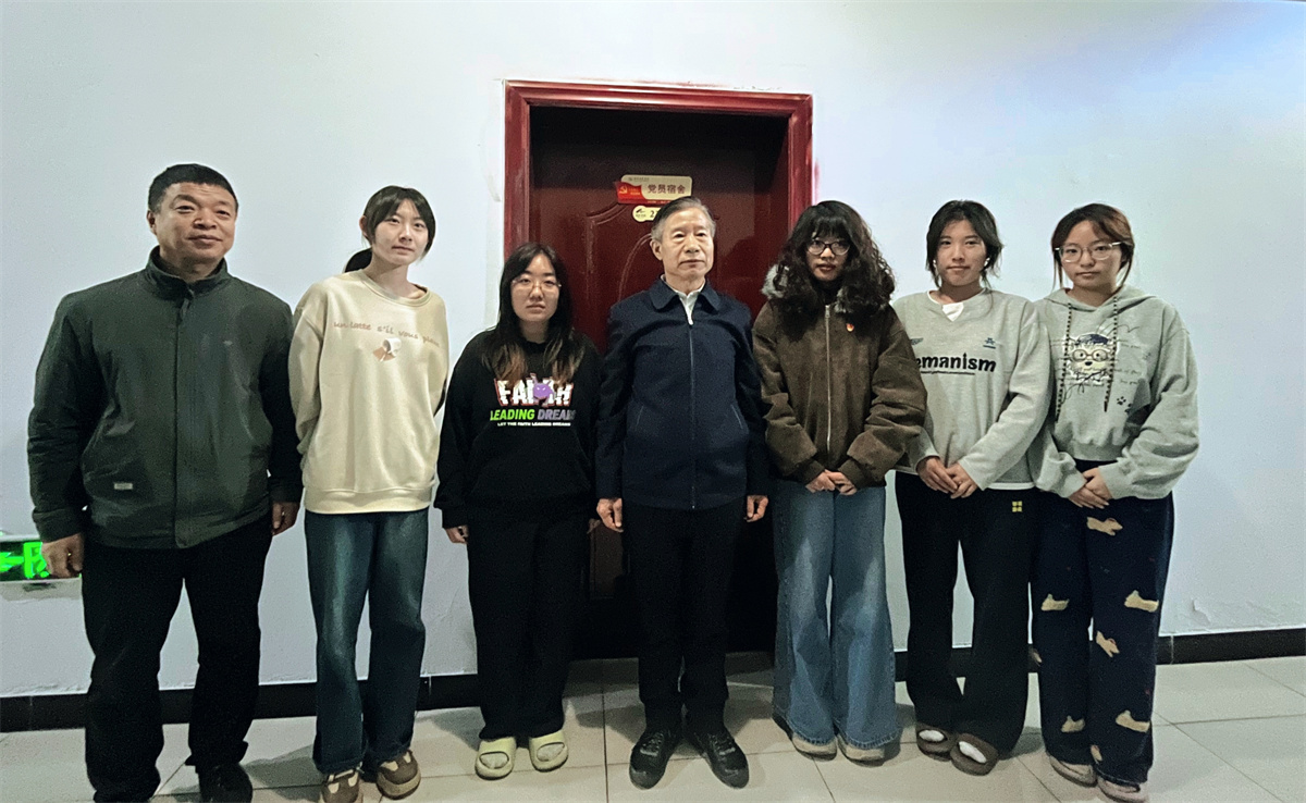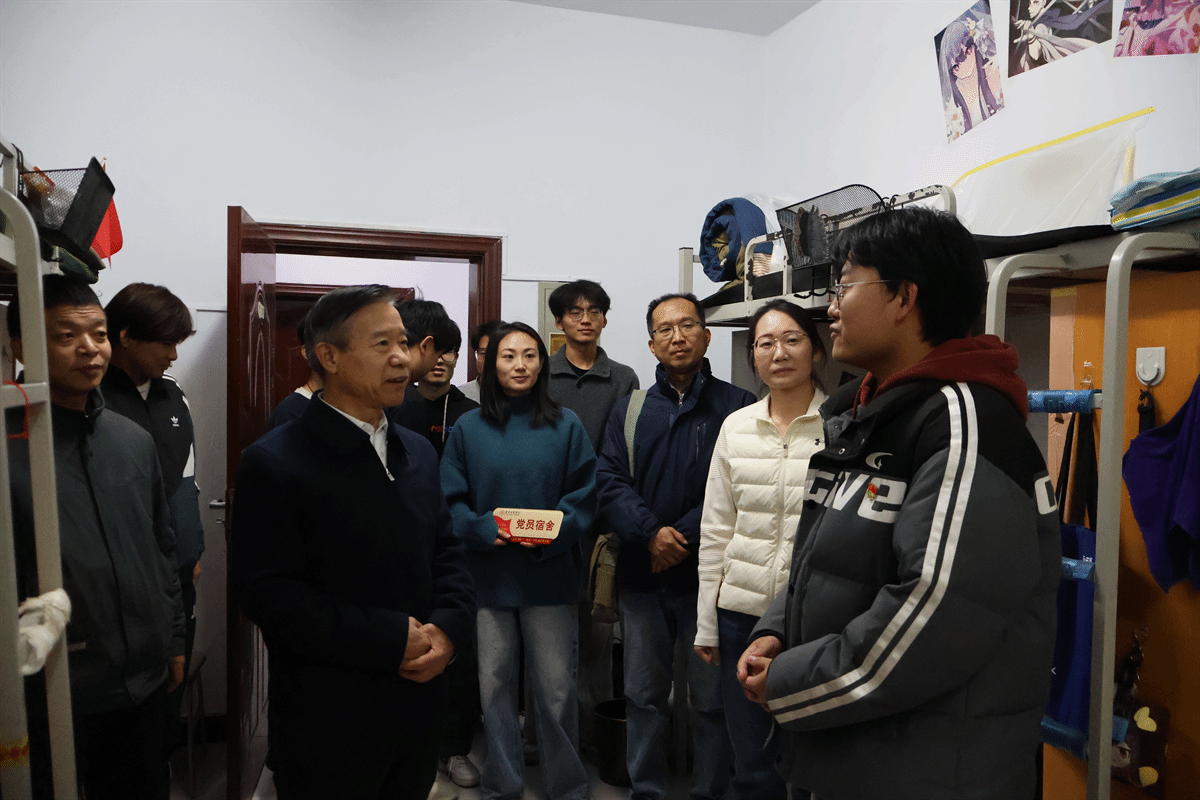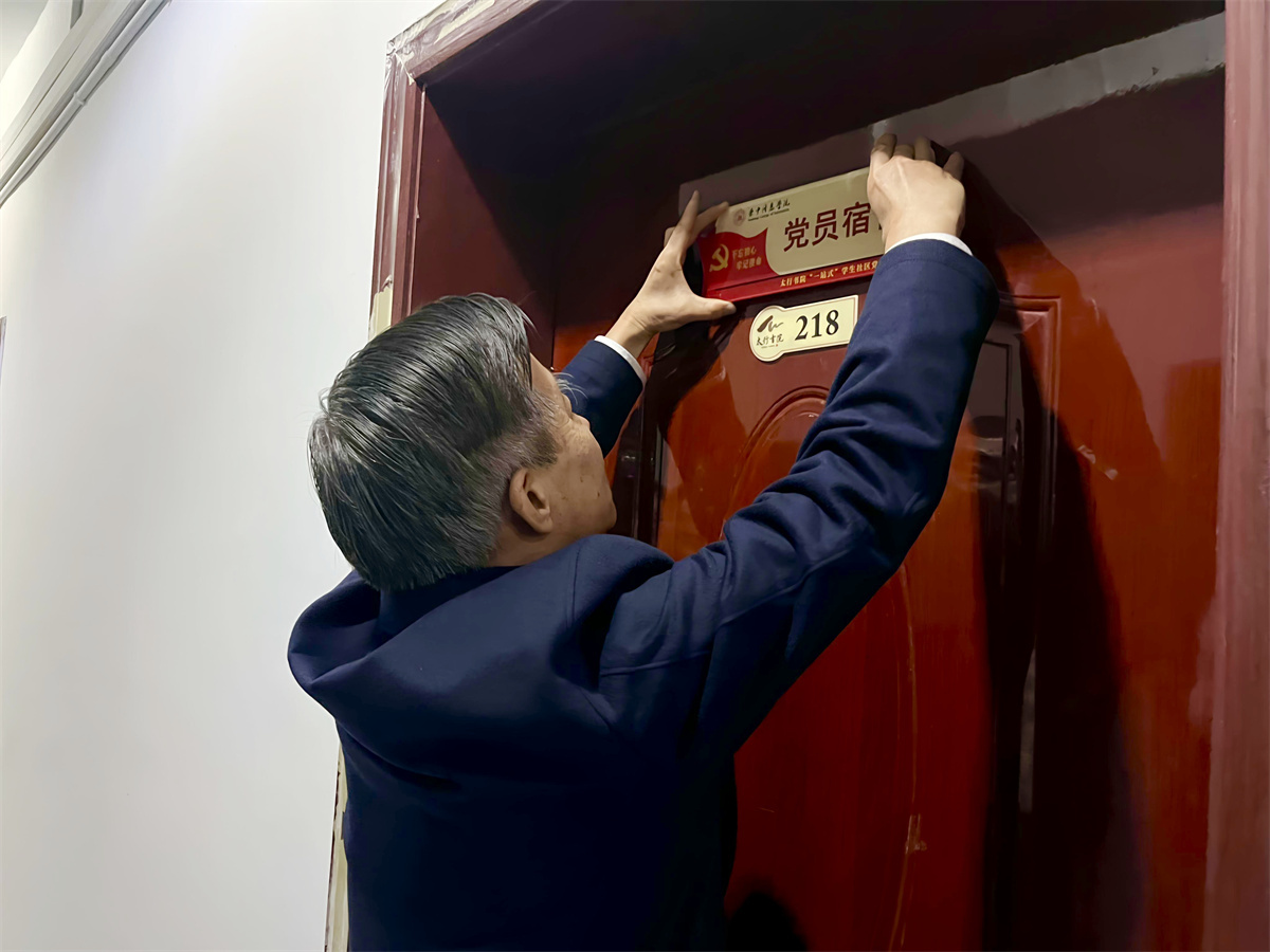 “宿舍挂牌·党员先锋表率”将现场延伸至学生生活的核心场域——宿舍。张书记、杨院长、徐部长走进宿舍,亲切询问同学们的学习生活情况。随后,庄重的“党员先锋宿舍”挂牌仪式在代表宿舍举行。张存伟书记亲自将鲜亮的“党员宿舍”标牌授予宿舍成员,悬挂于门楣之上。