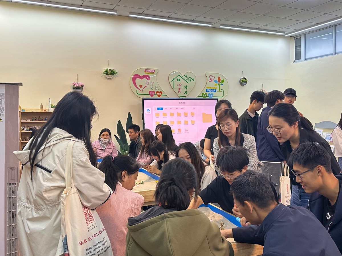 在心理健康教育中心景彩峰老师、古田老师、赵小芳老师的专业讲解以及解读下,家长们在心理健康中心的沙盘前驻足,光透过窗户洒在细腻的沙粒与微缩摆件上。家长们俯身观察沙盘场景,指尖轻触象征情绪的模型,听老师讲解沙盘游戏对情绪调节的疗愈作用,沉浸式体验压力释放与自我探索的疏导过程。