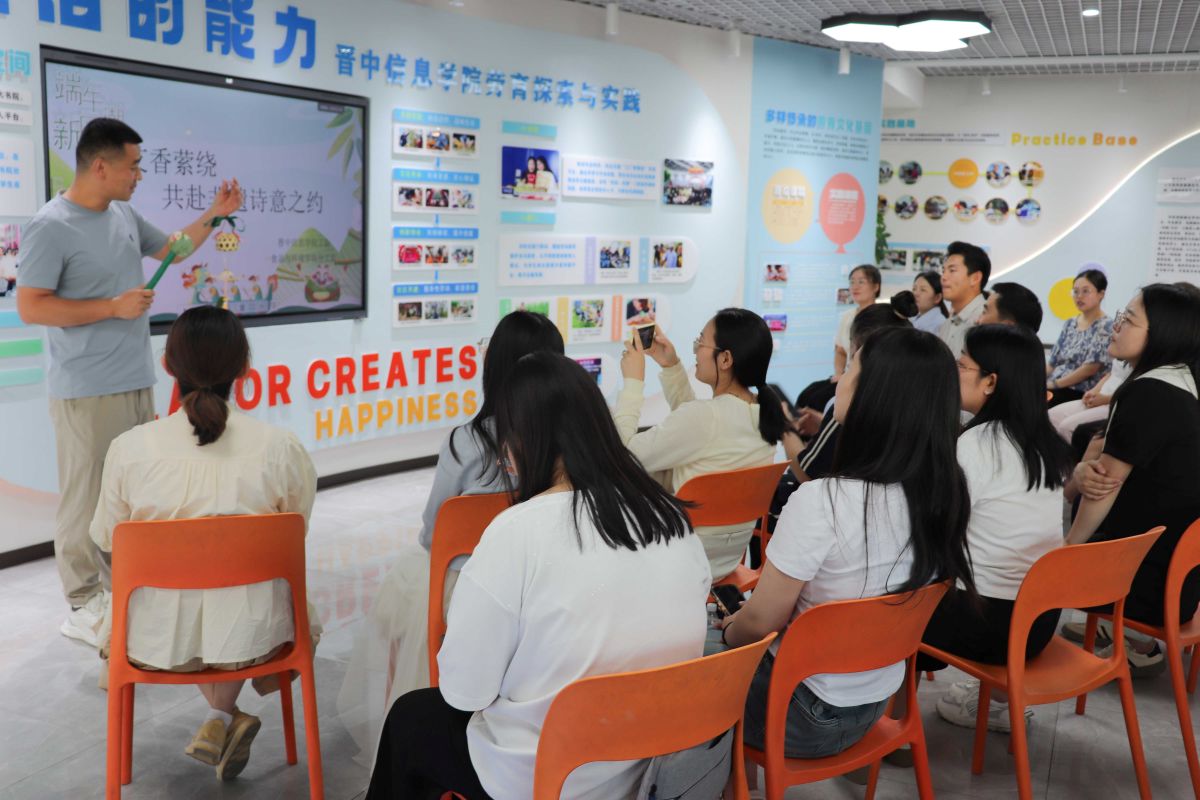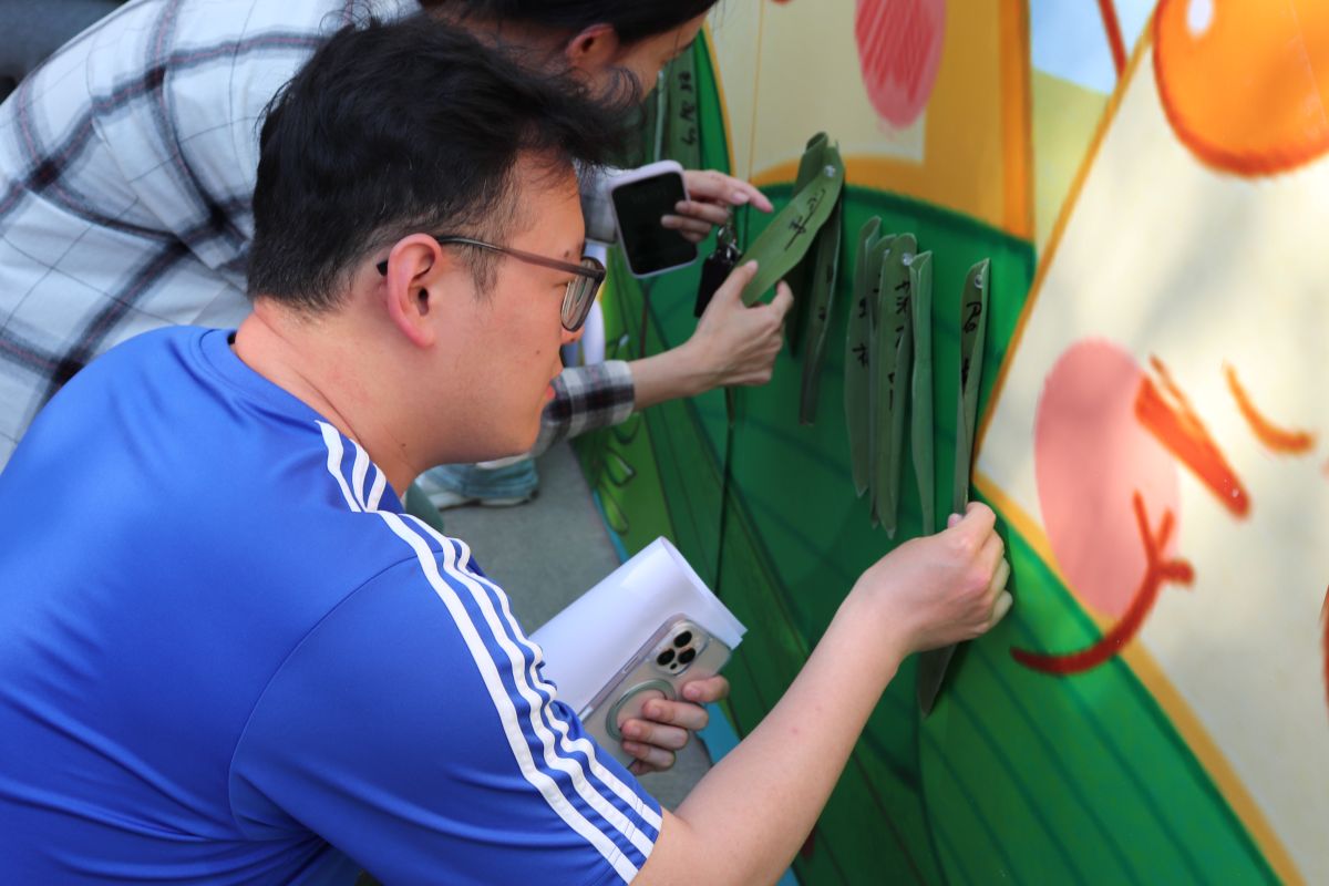 别出心裁的签到处人头攒动,老师们手持象征端午安康的翠绿粽叶,签下自己的名字。随着一片片粽叶被精心拼贴其上,原本的签到墙竟渐渐化身为一枚硕大无比、栩栩如生的“巨型粽子”!这个由众人共同完成的独特“粽形”签到墙,瞬间点燃了现场浓浓的端午仪式感。