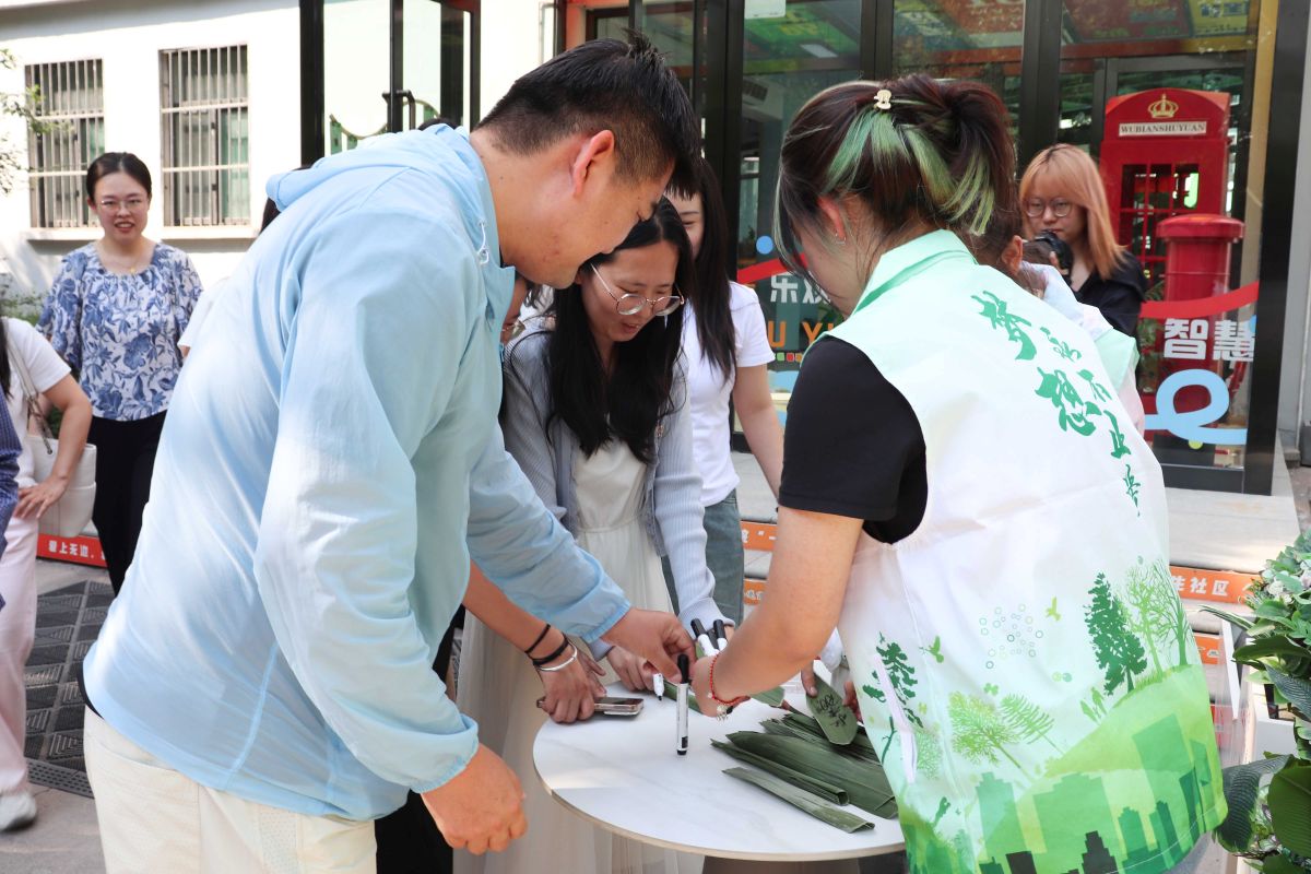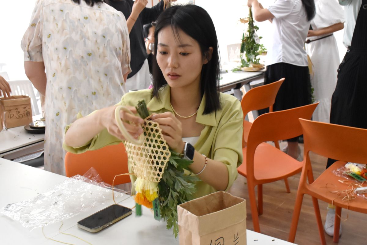 在艾草花束制作区,剪刀与艾草碰撞出清脆声响。老师们精心修剪艾草,打造出高低错落的层次感,再用素色包装纸与复古丝带进行装饰,并且别具匠心地加入干花与小灯笼挂件,让传统艾草束变身时尚花礼。“没想到艾草也能这么美!”赵素云老师捧着亲手制作的花束,惊喜地拍照分享道。这些兼具传统韵味与现代美感的艾草花束,成为活动现场最亮眼的 “打卡单品”。