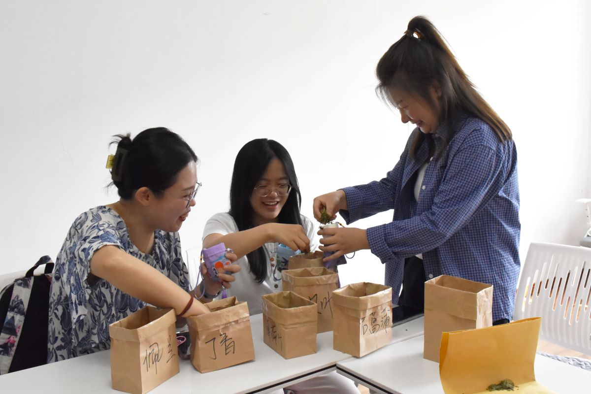 香囊制作区弥漫着天然中草药的芬芳。安丽霞老师为大家准备了艾草、藿香、丁香等十余种药材,以及刺绣精美的香囊袋。老师们在安老师的指导下,根据个人喜好精心搭配药材,将驱邪避瘟的美好寓意一同装入无纺布袋。“我特意多放了些薄荷,想让香味更清新。”刘丰齐老师边说边将袋口扎紧,再小心翼翼地装进香囊。不一会儿,福态可掬的柿子香囊、玲珑雅致的荷包香囊纷纷亮相,传统纹样与现代设计元素碰撞出别样的火花,每一个香囊都承载着对健康平安的祈愿,成为端午时节最温暖的祝福载体。