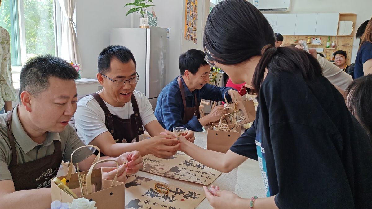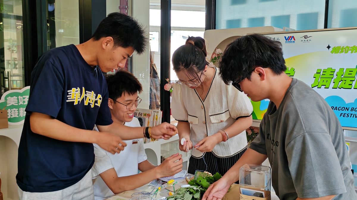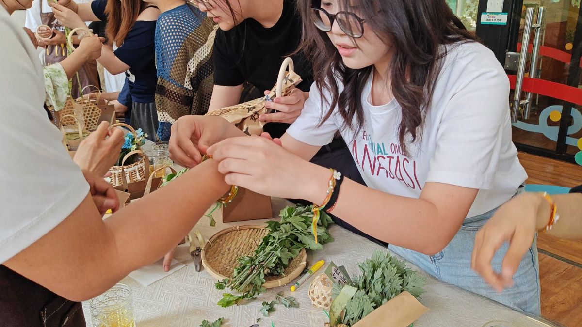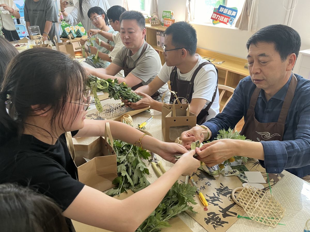 以艾传情,以香载福。桌面上长短交错的艾草散发着幽幽清香。无边书院综合办主任任爱玲老师适时讲解:“挑选艾草有个传统讲究,要取单不取双,这才符合端午‘扶阳抑阴’的节气特点,而且艾草一定要‘挂倒不挂正’,谐音‘到家’,寓意福气临门,可驱赶邪气。”雷老师随即拿起艾草进行示范,师生们认真聆听后开始精心制作。最后,师生们郑重写下心愿卡,并用铃铛、彩带等配件装饰花束,将美好期许珍藏其中。