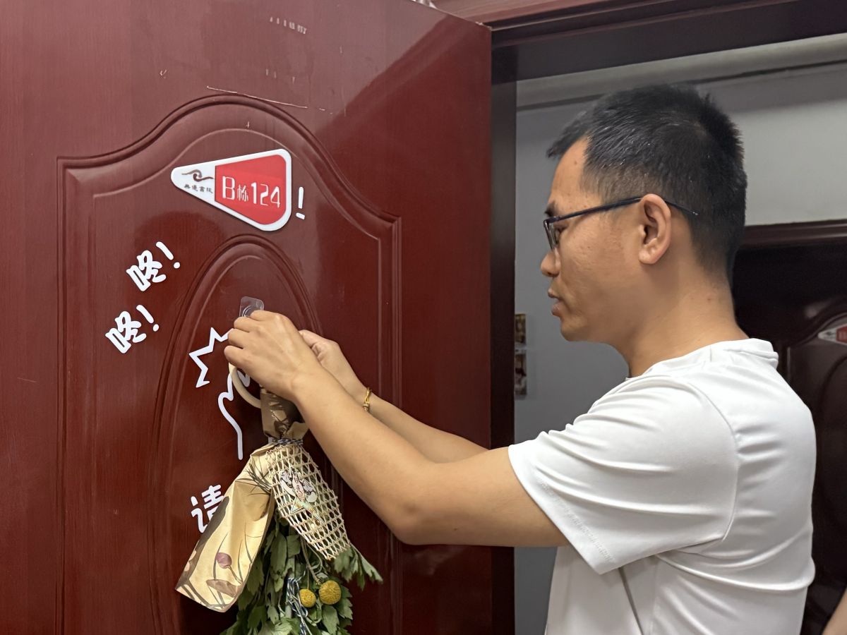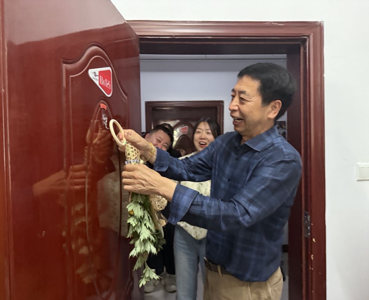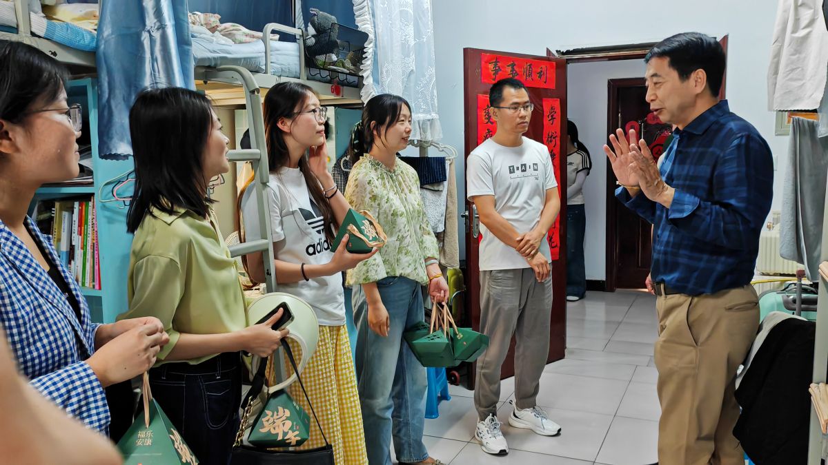 校院领导与老师们手持精心编织、缀满铃铛的竹编花束,捧着刚出锅还冒着热气的粽子,走进无边书院社区B栋宿舍楼。每到一间宿舍门前,傅校长便亲手将艾草花束悬挂于门楣之上,寓意着“驱邪纳吉,温暖常伴”,为学子们送去最真挚的节日祝福。来自无边B栋124宿舍的任倩飞同学开心地分享:“没想到能收到来自校领导亲手制作花束,真的太意外啦,这让在异地上学的我感受到了家的温暖。”随后,老师们又将热气腾腾的粽子一一递到同学们手中,并给予“端午安康,学业有成,未来可期”的祝福。