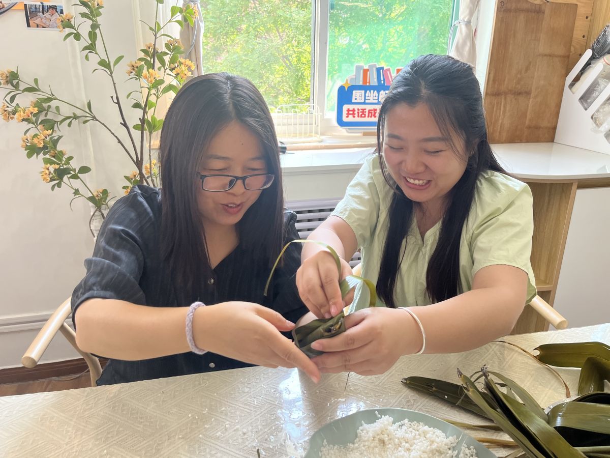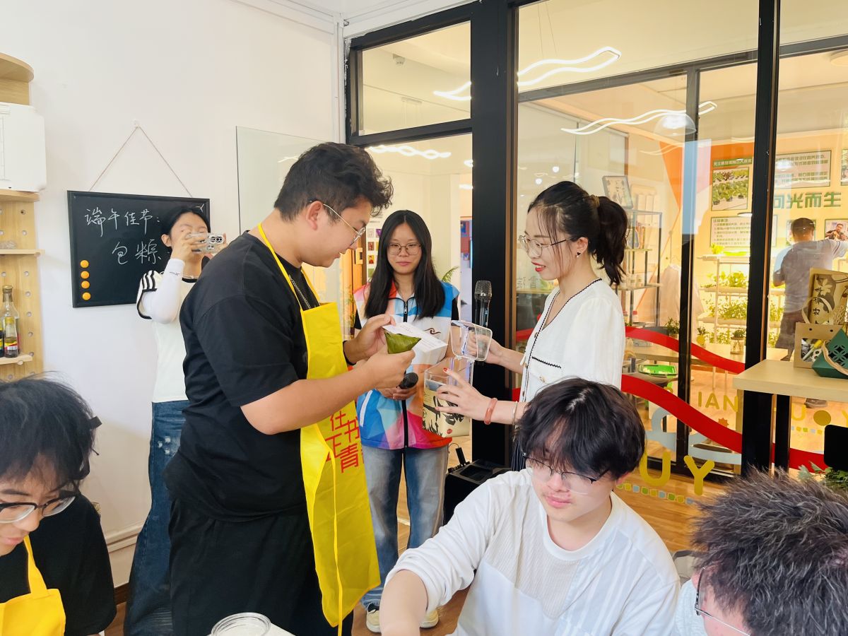 端午时节,粽香四溢。热烈的问答环节结束后,活动现场摇身一变,化作充满传统韵味的“美食工坊”。师生们纷纷化身“厨房能手”,在传统习俗与创意灵感的交织中,开启了一场别开生面的体验之旅。长桌上,翠绿的粽叶、晶莹的糯米、甜蜜的红枣依次铺展,箬叶的清香在空气中悄然弥漫。师生围坐,折粽叶、填糯米、捆粽绳…… 虽然动作略显生疏,但欢声笑语却始终萦绕在房间每个角落。
