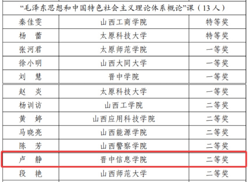 在山西省教育厅举办的第二届全省高校思想政治理论课教学展示活动中,我校2名思政课教师荣获全省特等奖,1名教师荣获全省二等奖。