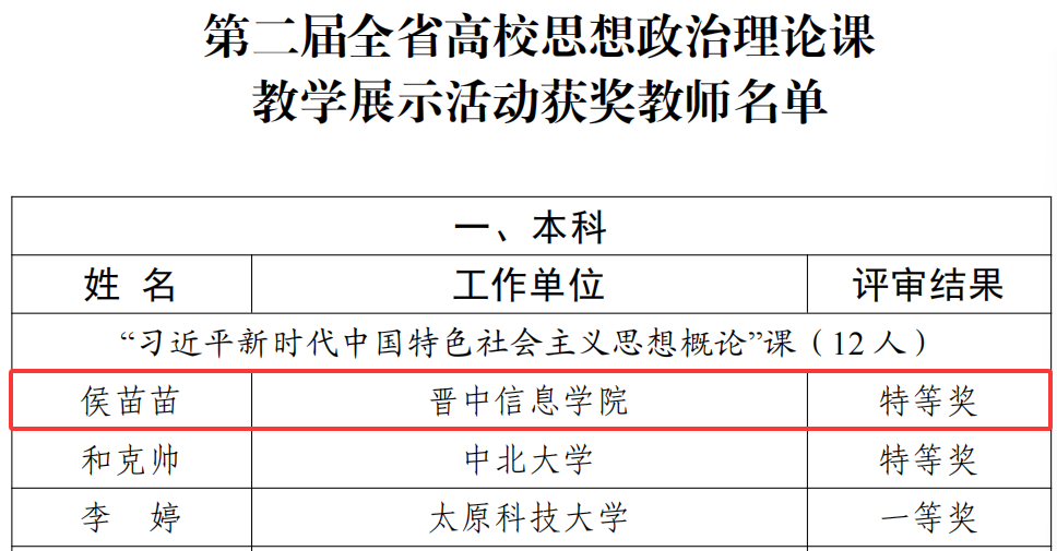 侯苗苗荣获《习近平新时代中国特色社会主义思想概论》课程特等奖;