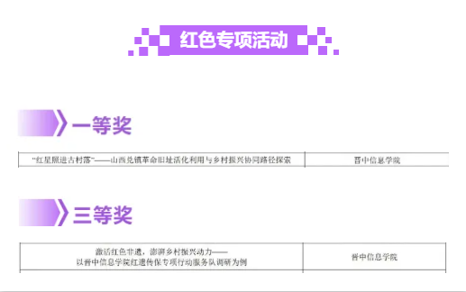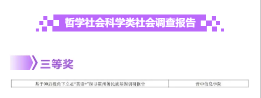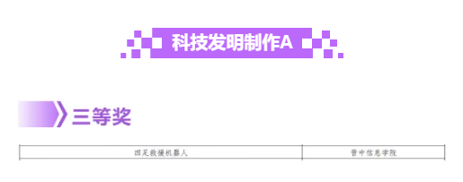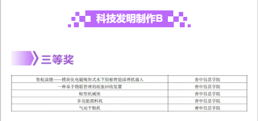 经过激烈角逐,全省共评选出特等奖作品57件、一等奖作品105件、二等奖作品182件、三等奖作品392件,其中,由我校推报的24件作品分别荣获自然科学类学术论文序列三等奖3项,科技发明制作A序列三等奖1项,科技发明制作B序列三等奖5项,哲学社会科学类社会调查报告序列三等奖1项,“人工智能+”赛道序列三等奖4项,红色专项活动序列一等奖1项、三等奖1项。