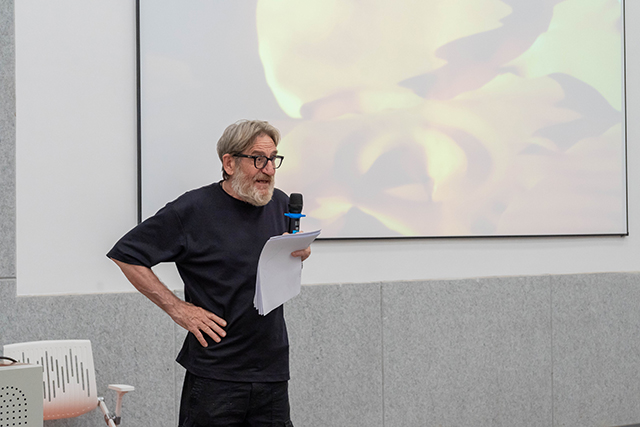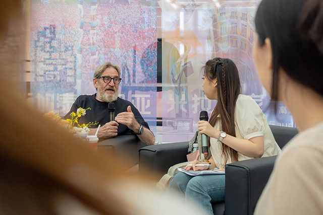 提问交流环节,师生们与Josep Cerdà Ferré 教授就声音雕塑问题展开热烈交流。教授鼓励学生们要勇于打破既有规则,在跨文化对话中寻找艺术认同点。Josep Cerdà Ferré 约瑟夫・塞尔达・法雷教授聚焦“新理念(Ideas Nuevas)”与“语境(Contexto)”两大核心概念,以“墨滴画布”隐喻艺术创作中“意外性”的价值。他强调,随着中国传统文化的强势崛起,中欧艺术对话迎来全新契机,青年学生应从传统造物智慧中汲取养分,寻找当代创作的文化根基。教授特别提醒青年学生理性看待人工智能,他认为人类思维能将形式、情境、概念与经验进行创造性关联,以诗意方式表达情感,这是人工智能无法企及的,呼吁学生保持独特的艺术创造力。