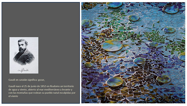 Gaudí es hijo y nieto de caldereros, su padre y su abuela de una lámina de cobre plana y bidimensional, hacían formas tridimensionales golpeando rítmicamente con el martillo. Toda la arquitectura de Gaudí tiene este principio constructivo, la forma se construye de dentro hacia fuera como hacen los caldereros picando el metal. El sonido para Gaudí fue un elemento muy importante, el sonido está compuesto de intervalos y ritmos, tal como escuchaba en su casa desde que nació. Los ritmos sonoros de los caldereros son los que configuran la forma. Gaudí dijo en una ocasión que el vacío se origina mediante el sonido.