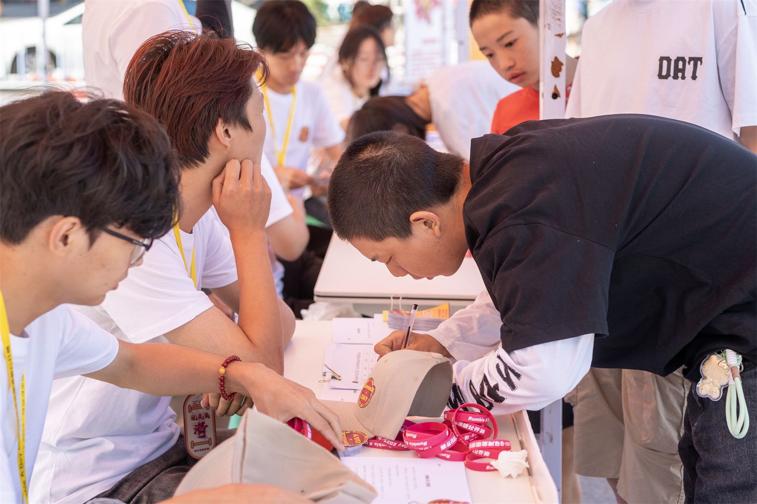 轰隆声在校门口响起,各参赛选手在检录处完成检录后,脚踏滑板进入校园,五颜六色的板面冲出一道青春靓丽的风景。签名墙上,既有“00后”大学生涂鸦的个性宣言,也有职业滑手沉稳有力的签名。滑板公园及竞技公园内,有人反复调试滑板轴承,有人在热身区上下穿梭;大学生组的选手们脸上洋溢着青春的光芒,他们互相鼓励,共同探讨着地形与动作,力求在比赛中展现出最佳的自己。社会组包含了报名前来的资深滑手及慕名而来的少年滑手,资深滑手们以他们的经验和技巧在赛场上如履平地,少年滑手们初生牛犊不怕虎,跃跃欲试要在赛场上大展身手。