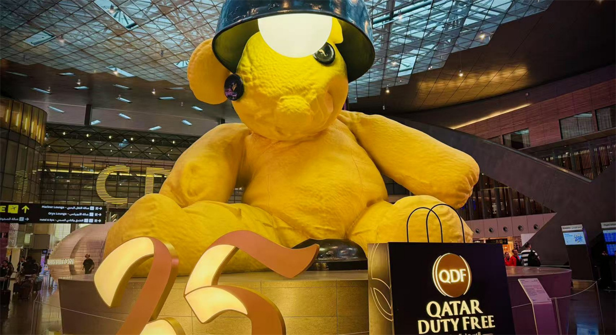 经8小时飞行,团队于多哈哈马德机场开启首段国际中转。这座连续多年获评"全球最佳机场"的枢纽,以未来感设计与多元服务消解了长途旅行的疲惫:C区室内热带雨林区,师生们围坐充电躺椅,透过穹顶玻璃仰望天空;中央大厅的巨型“KAWS公仔”与“大黄熊”(Lamp Bear)雕塑成为打卡热点。机场全流程电子化服务令人印象深刻——自助值机、人脸识别通关、行李转运状态实时推送,展现了卡塔尔航空作为五星航司的硬实力。
