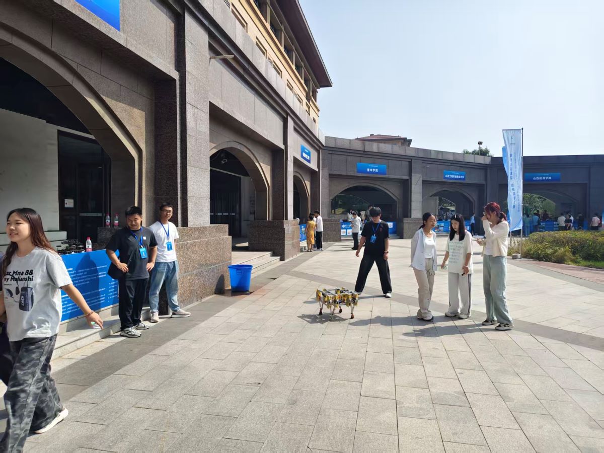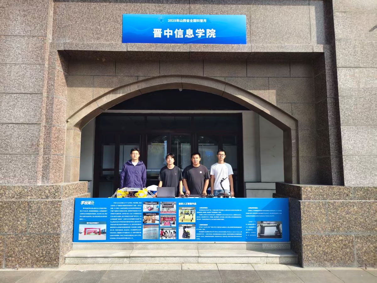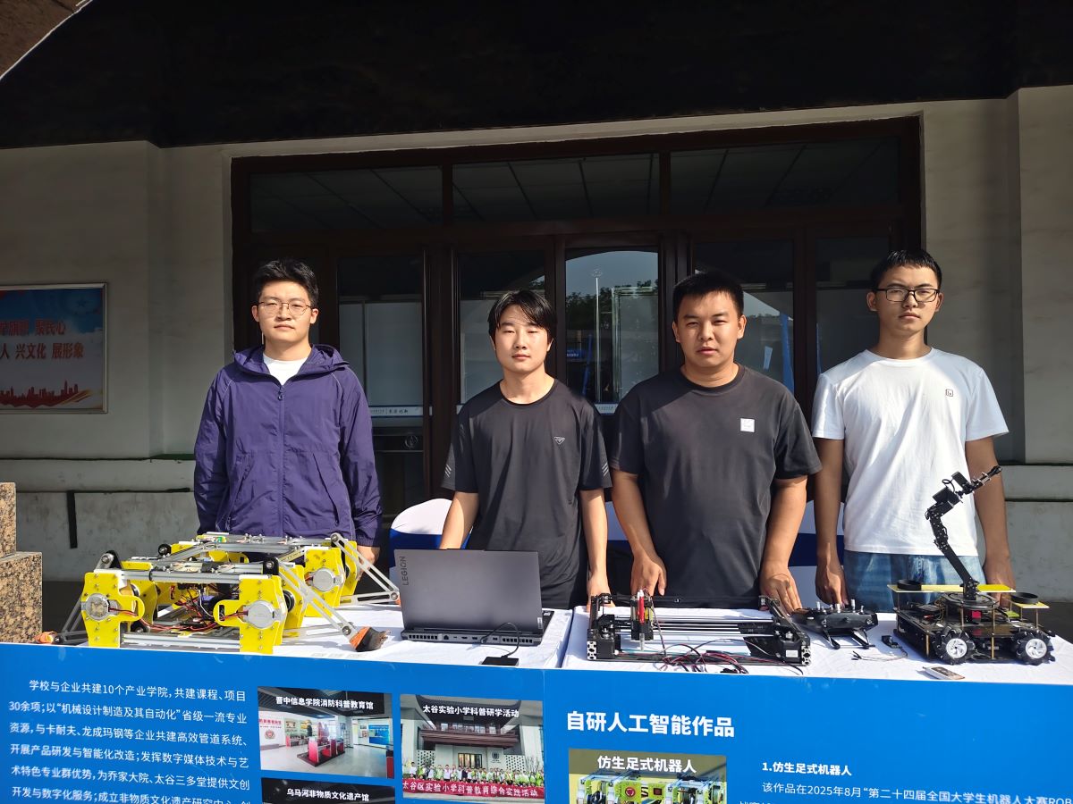 在展会现场,我校以“成果展示+互动体验”参展方式,既系统呈现了学校科技工作成效,又通过实物陈列、现场演示、沉浸式体验等多元化形式,生动推介三项自研科技作品:仿生足式机器人,该作品在2025年8月举办的“第二十四届全国大学生机器人大赛 ROBOCON 仿生足式机器人挑战赛”中,凭借稳定的越野性能、精准的障碍跨越能力及出色的竞速表现,斩获越野赛、障碍赛、竞速赛国家级二等奖;智能物流搬运车,聚焦工业场景需求研发,于2025年5月“中国大学生工程实践与创新能力大赛山西赛区智能物流搬运赛项”中,以高效的路径规划与货物搬运能力荣获省级二等奖;导轨式写字机器人,融合机械控制与自动化技术,在2025年“挑战杯”山西省大学生课外学术科技作品竞赛中获得省级三等奖。