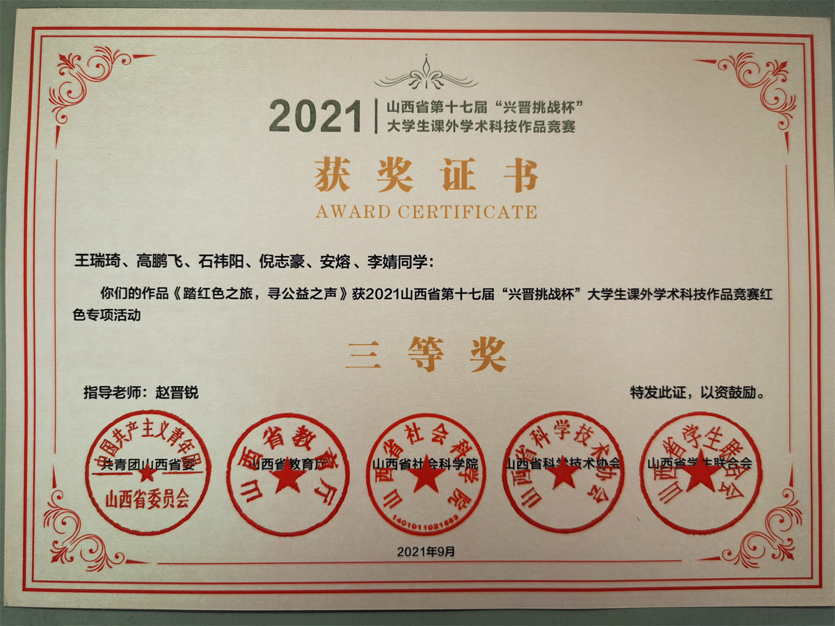 智能工程学院青年志愿者协会选送的项目“踏红色之旅,寻公益之声”荣获第十七届挑战杯红色专项活动三等奖